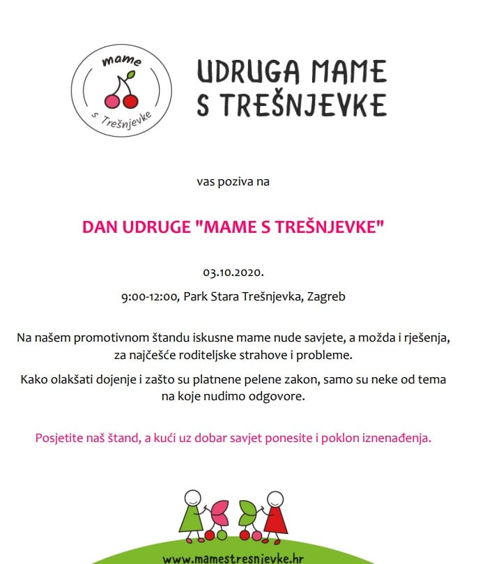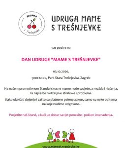 Dan udruge Posted on 02.10.2020. by mamestresnjevke Ove godine, zbog specifične epidemiološke situacije, nismo u mogućnosti ponoviti naše druženje u CeKaTe-u, ali ipak smo odlučile obilježiti dan naše udruge. Vidimo se u subotu, 3. 10. od 9 do 12 sati, u Parku Stara Trešnjevka.